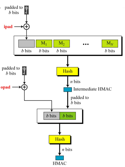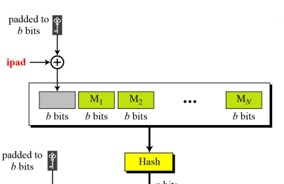 - 메시지에 b-bit 로 padding 그리고 ipad 와 XOR 연산을 거친 키를 붙여 첫번째 해시 함수 적용