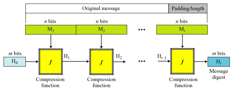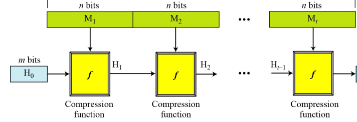 - 최종적으로 구해지는 Digest 값 \(H_{t}\)이 최종 해시 함수의 결과 값이 됨