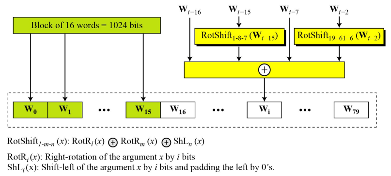 $$ \begin{align*} W_i=W_{i-16}\oplus RotShift_{1-8-7}(W_{i-15})\oplus W_{i-7}\oplus RotShift_{19-61-6}(W_{i-2}) \end{align*} $$