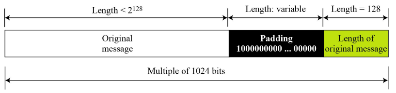 $$ \begin{align*} Last\ Block=(Message)\,mod\,(1024) +Padding+128=1024bits& \\Padding<1024bit& \\Padding = 1024-(Message)\,mod\,(1024)-128 \end{align*} $$